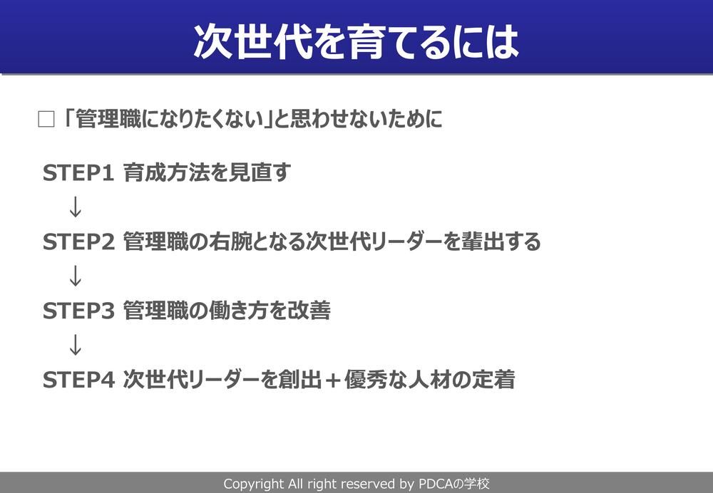 なので、「管理職になりたくない」と思わせないためには4つのステップがおすすめです。まずは育成方法の根幹の部分を見直していきましょう。そして、管理職の右腕となる次世代リーダーを輩出するためにターゲットを決めていく。
