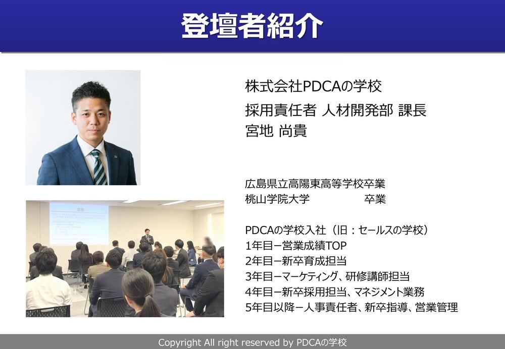 では、自己紹介と本題に移りたいなと思っています。株式会社PDCAの学校の宮地と申します。よろしくお願いいたします。私は主に営業と採用の2軸で活動しております。