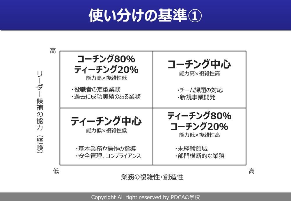 一番難しいのが、この(能力と複雑性の)割合が分かれている部分ですね。右下の部分と左上の部分をどういう基準で判断していくのか。右下の場合で言うと能力はまだ高くないんですが、けっこう複雑で創意工夫が求められる業務に取り組んでいきますので、ここは(ティーチングとコーチングの)併用が求められます。