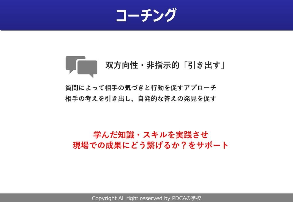 一方でコーチングは「引き出す」という能力が求められます。なのでよく言われるのが、「相手の根っこにあるスキルを引き出して自律を促進するんだ」っていう、これまた難しい言葉を用いられたりもするのですが(笑)、重要なのは「教える」ではなく「引き出す」ということです。