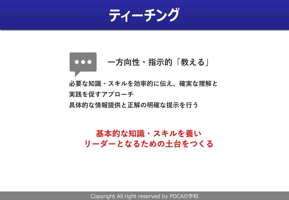 では、ティーチングとコーチングで実際にリーダーをどうやって育成していくのか。ここをお伝えできればなと思っています。まず、そもそもティーチングとコーチングの違いの部分からお伝えできればなと思っていますので、具体的なコツに関しては後ほどお伝えします。