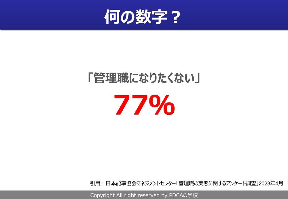では、さっそくではございますが、プレゼンでありがちな「この数字は何でしょうか?」というところからいければなと思っております。日本能率協会マネジメントセンターの「管理職の実態に関するアンケート調査」の数字です。なので管理職に関係している数字にはなるのですが、この「77パーセント」は何を表している数字だと思われますでしょうか?