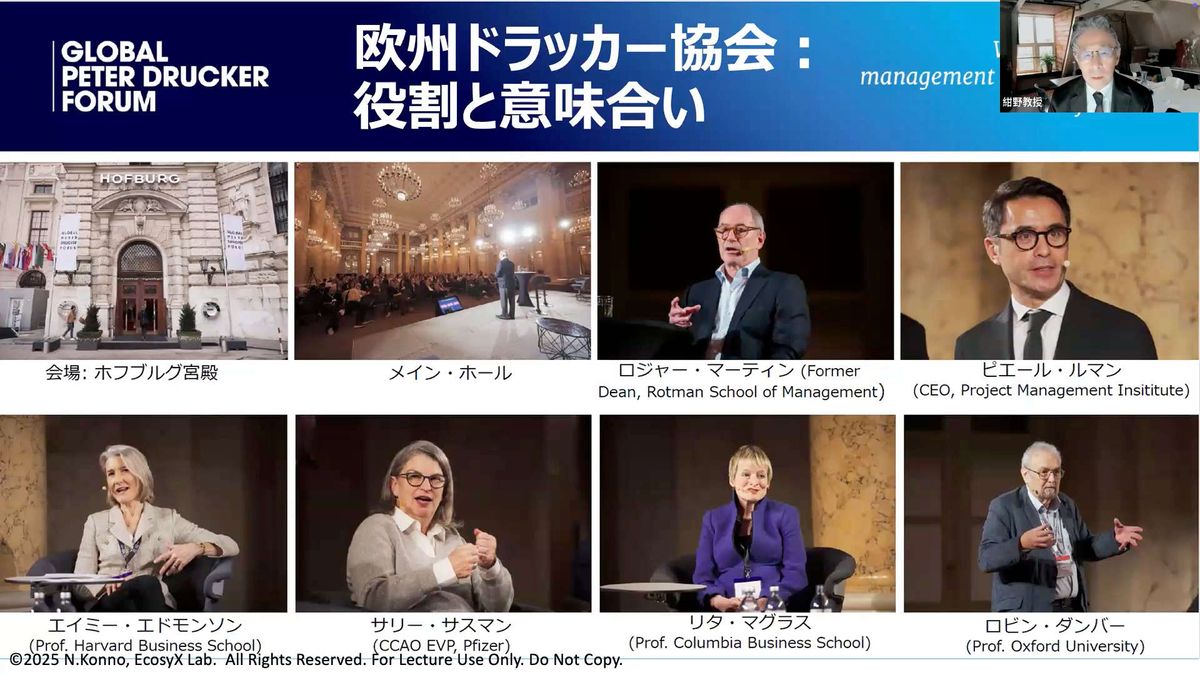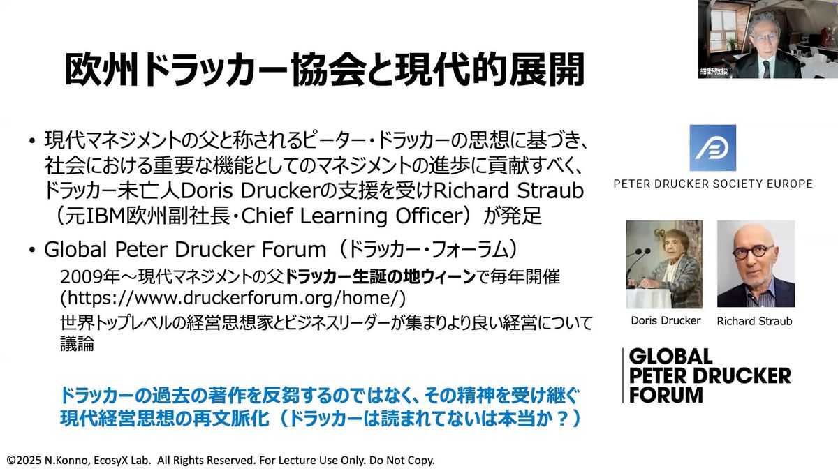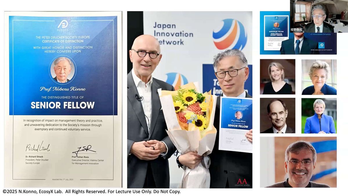 このドラッカー協会とは以前からご縁がありまして、さまざまなかたちで関わってきました。数年前には、右上の写真にもありますが、今年(2025年)に亡くなられた一橋大学の野中郁次郎先生が「Honorary Fellow(名誉フェロー)」として選ばれています。私は「シニアフェロー」として同じ枠組みに加わるかたちになります。ほかにもこれまで何人かがフェローとして登録されており、今年は私が新たに加わったということになります。