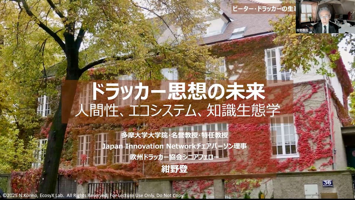 紺野登氏(以下、紺野):みなさん、こんばんは。紺野登です。今日は「ドラッカー思想の未来」という重たいテーマをいただきましたが、肩の力を抜いてお聞きください。今ご覧いただいている写真は、ウィーン郊外にあるドラッカーの生家です。