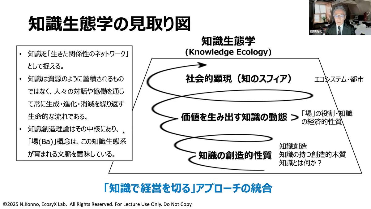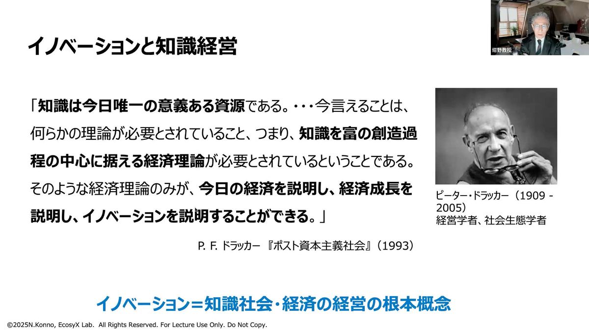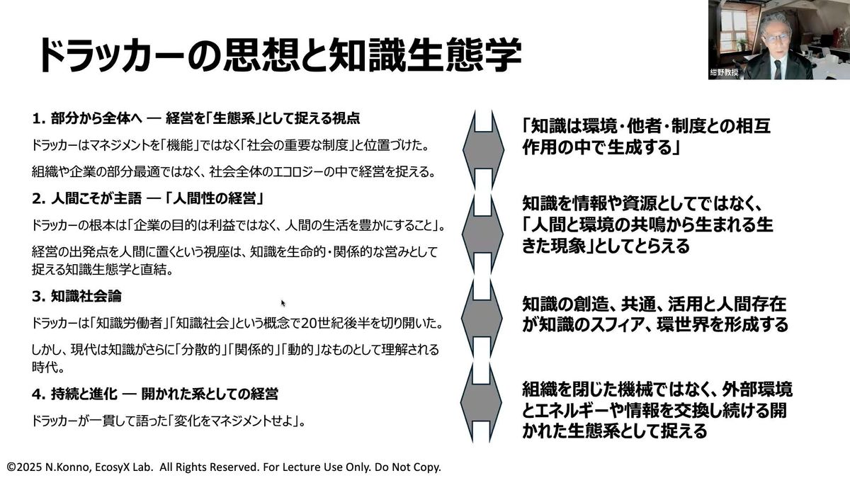 この知識生態学の目的は、「知識によって経営を切る」視点を提示することにあります。従来の経営学を否定するのではなく、そこに新しい層を重ねることで、より現代の経営に合った説明を試みるものです。今後はこの考え方を、欧州ドラッカー協会とも連携しながら展開していきたいと考えています。