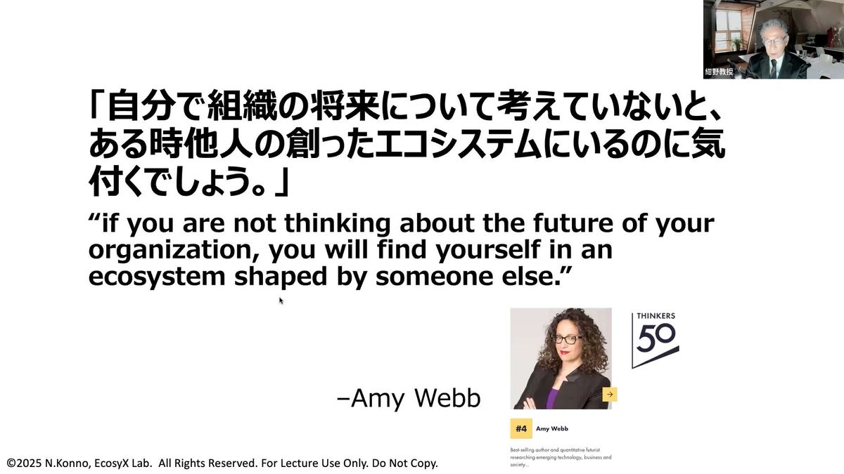 これは警鐘の言葉です。つまり、エコシステムというのは目に見えにくいけれど、確実に私たちのビジネスや社会の基盤を変えていく。気づいた時には、もう誰かの仕組みの一部になっているかもしれない。