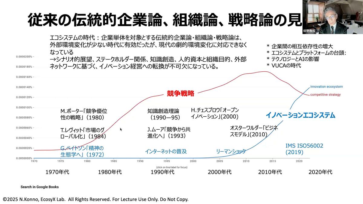 ここで注目してほしいのが、ブルーのラインです。これは「イノベーション・エコシステム(Innovation Ecosystem)」というキーワードの出現頻度を示しています。これがちょうど2020年ごろ、先ほどの「競争戦略(Competitive Strategy)」の関心を上回っていくんですね。これは1つの大きな転換点、つまり“エポック”だと思います。
