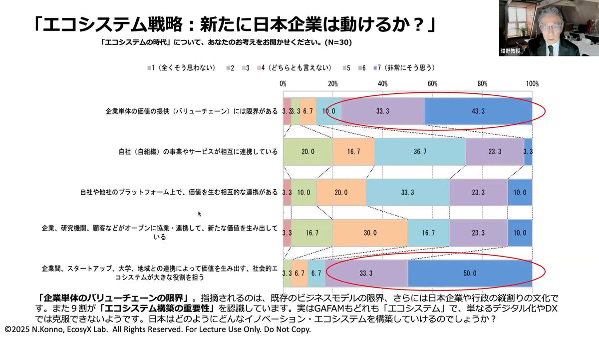 一方で日本では、「エコシステムは大事だよね」という理解にとどまり、実践や理論構築がまだ十分に進んでいません。ですから、こうした研究と実践の両輪を進めることが、今後の課題であり、私たちが取り組んでいるテーマでもあります。