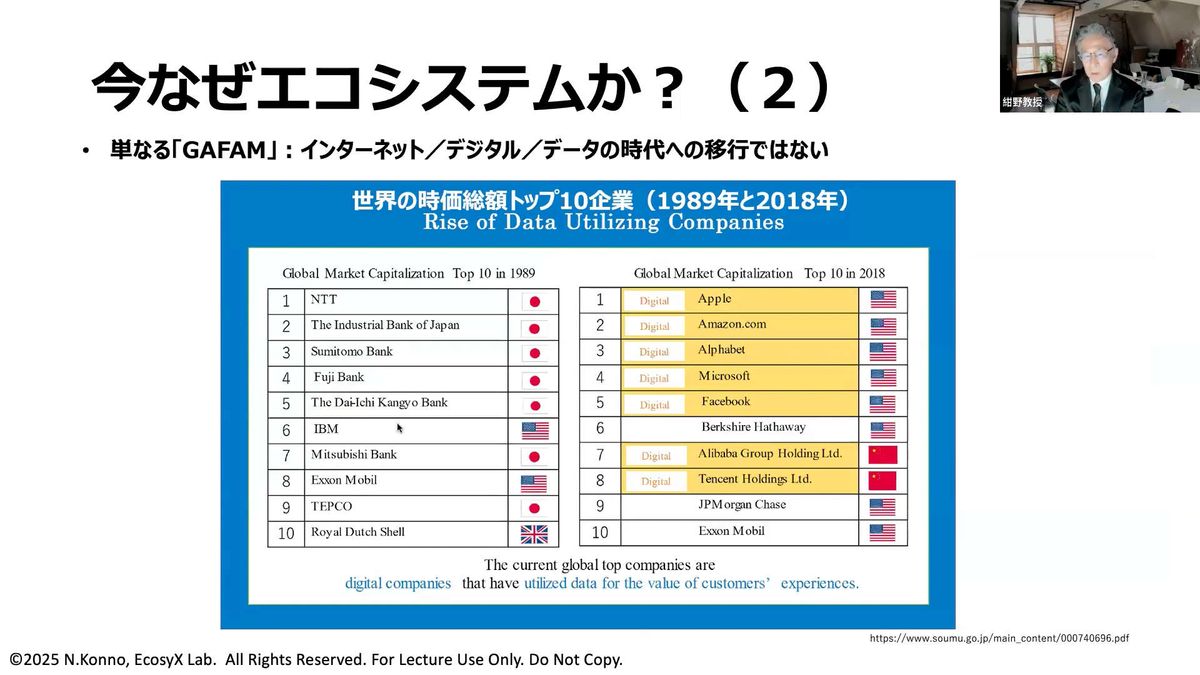 上位をほとんど日本企業が占めています。一方、右側の図はその30年後のデータで、GAFAMを中心としたアメリカ企業、さらに中国の企業が上位を占めている。いずれも“デジタル”と書かれています。