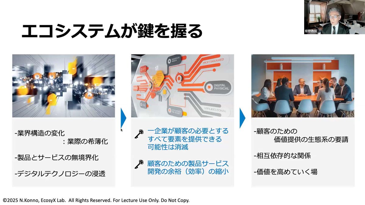 この状況で重要になるのが右側のボックス、「顧客のための価値提供エコシステム」です。複数の企業や組織が相互依存的に関わりながら、全体として顧客に価値を提供していく。そのネットワーク全体をエコシステムとして捉える考え方です。