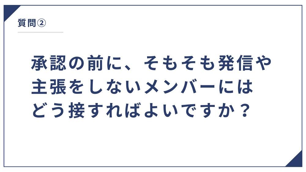 橋本:みなさんも「こんなことを聞いてみたいな」というものがあれば、ぜひお気軽にチャットに入れていただけるとうれしいです。じゃあ、2つ目の質問ですね。「承認の前に、そもそも発信や主張をしないメンバーにはどう接すればいいですか?」。