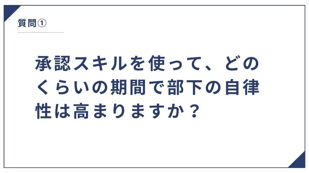 平岡:うん、そうですね。人によってはもともと自律性が高めの人もいらっしゃるので、さらにすぐに上がったりもすると思うんですが、(承認スキルを使って部下の自律性を高めるためにかかる時間は)メンバーさんによってかな、というところではあります。相当手ごわい方で1年の経験はありますね。