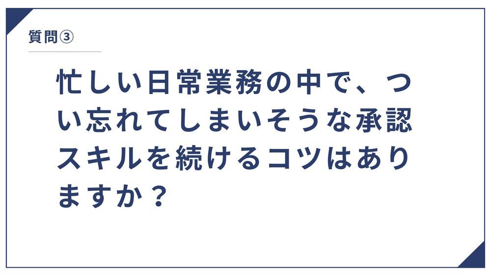 橋本:3つ目の質問です。「忙しい日常業務の中で、つい忘れてしまいそうな承認スキルを続けるコツはありますか?」。知りたいですね。洋平さん、どうですか?
