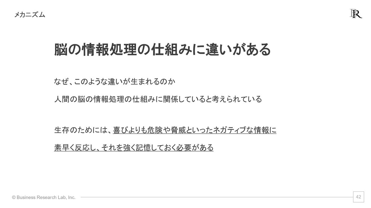 ですので、ネガティブな情報に対して強く反応する、強く記憶するような傾向があります。これをネガティビティ・バイアスと呼ぶんですが、そのようなバイアスがあるわけです。