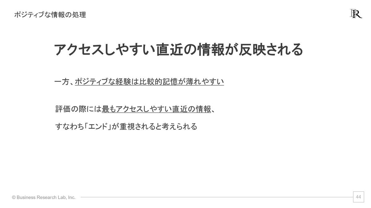 ただ、エンドは最近なわけですよね。今に近いわけです。今に近いほうが、記憶はアクセスしやすいわけですね。一番覚えているのは最近の記憶ということで、ポジティブな感情についてはエンドの影響を受けるということが当てはまるわけです。