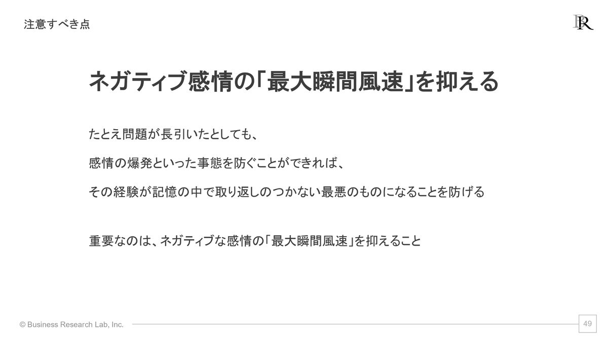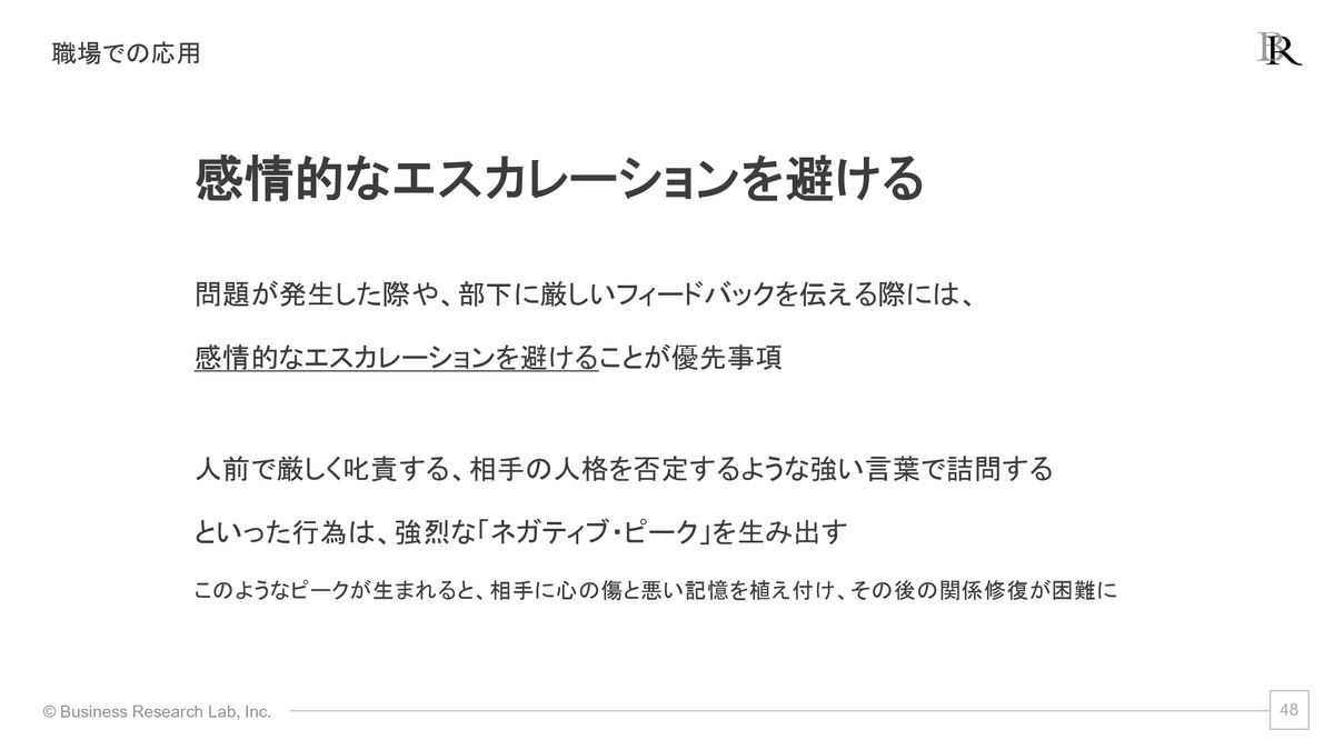 ネガティブ・ピークが発生しやすいような状況はありますよね。例えば、部下に対して厳しいフィードバックをしないといけないというような状況。そういう時に厳しく叱責したり、これをやる方はいらっしゃらないと思いますが、人格を否定するような強い言葉で詰問したりすると、とても大きいネガティブ・ピークが生まれるわけです。