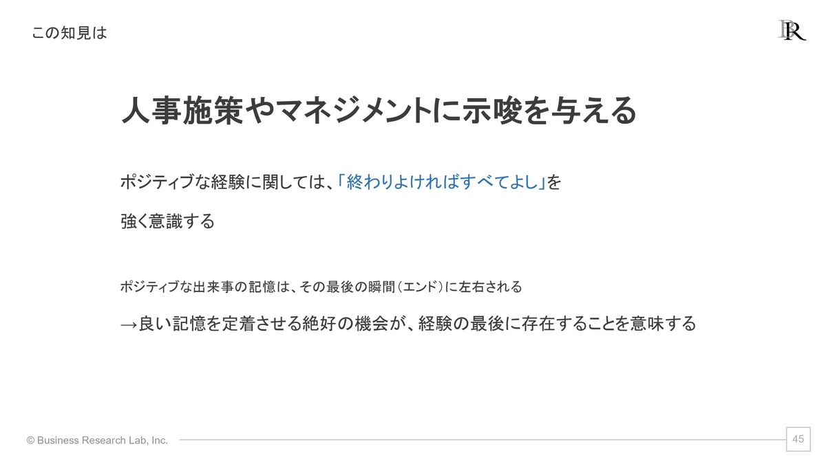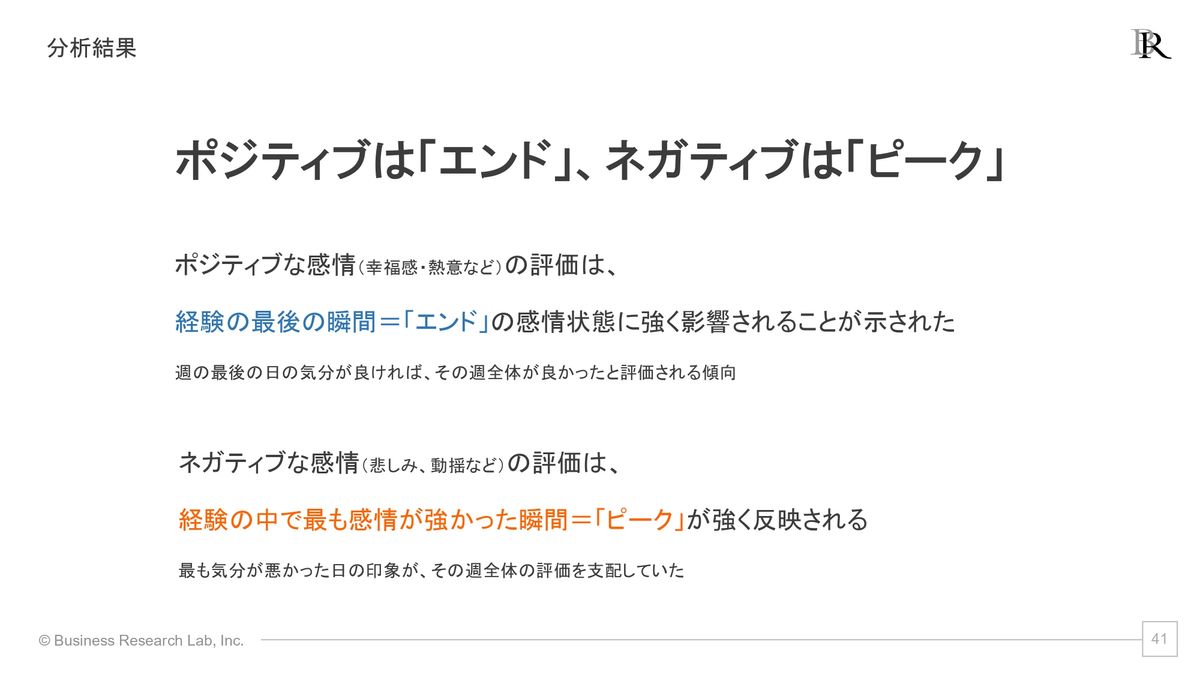 要は、ポジティブ・エンドが大事ということなんですよね。まさに「終わり良ければすべて良し」ということを非常に反映していると思うんですが、ポジティブな感情はエンドが大事ということです。