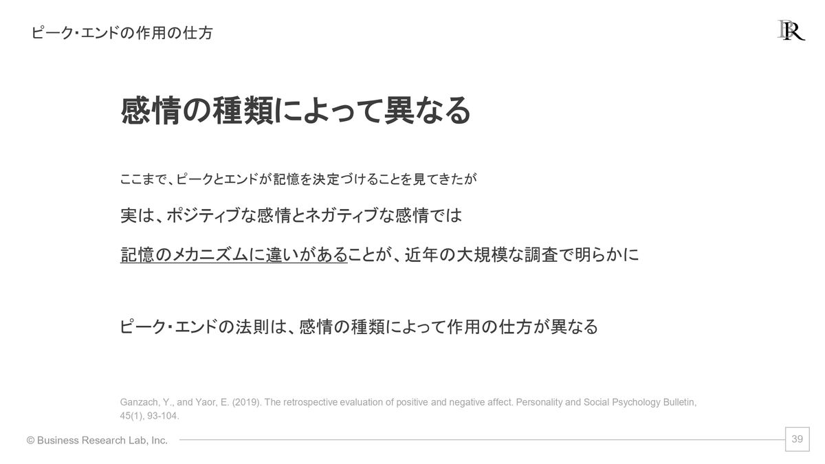 ポジティブな感情とネガティブな感情。これは記憶のメカニズムがちょっと違っているんですね。そういうことが最近の調査の中でわかってきたので、みなさんに紹介させていただきます。ピーク・エンドの法則は、実は感情の種類のようなものによって影響が少し変わってきますよというような研究です。