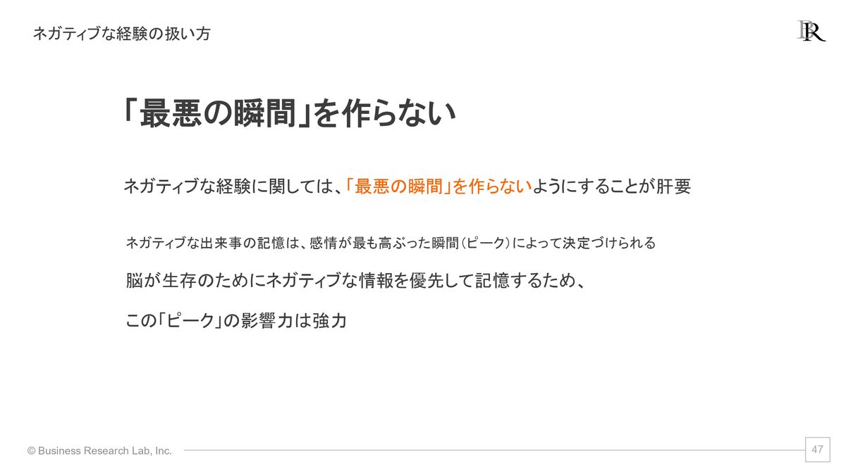 ネガティブな情報は基本的にポジティブな情報よりも強く処理されます。そして鮮明に記憶に残ります。ですので、ネガティブな経験というのはピークが非常に重要になってくるんですね。ピークが記憶に刻み込まれやすい。そして後の評価に対して影響を及ぼしやすいことがわかっています。