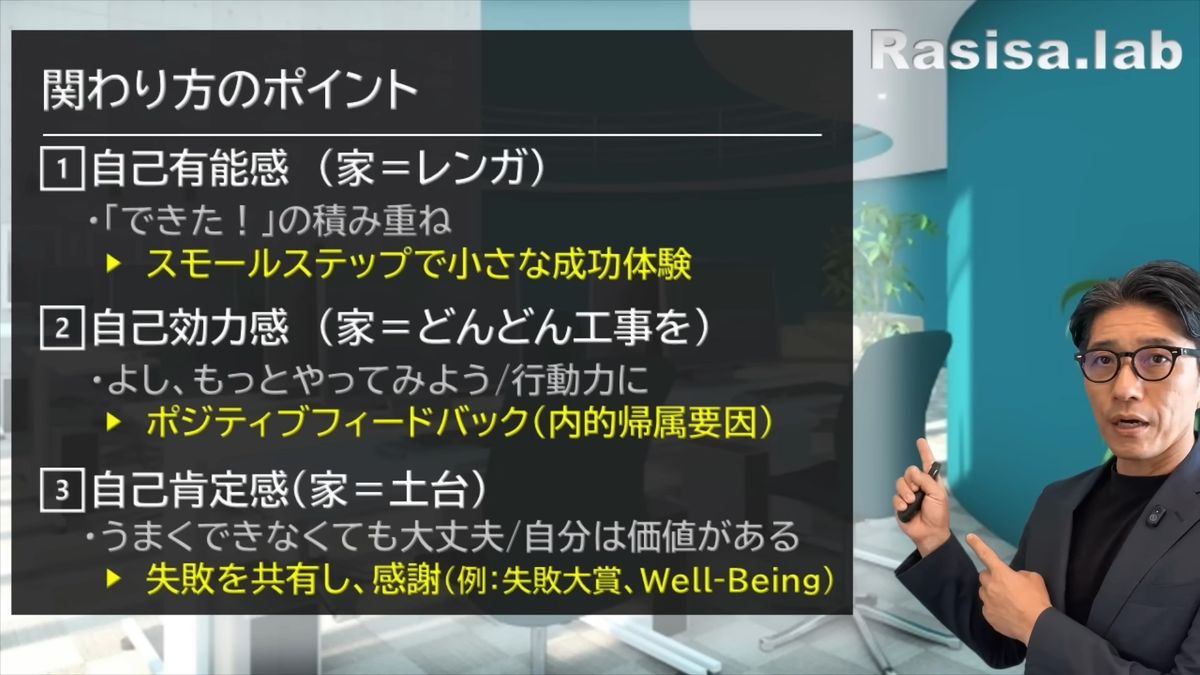 1つ目、「自己有能感」が足りなかったんですよね。「できた!」の体験が少ないんです。その人、特に新人に効果的なのは、スモールステップで小さな成功体験を積ませるということです。
