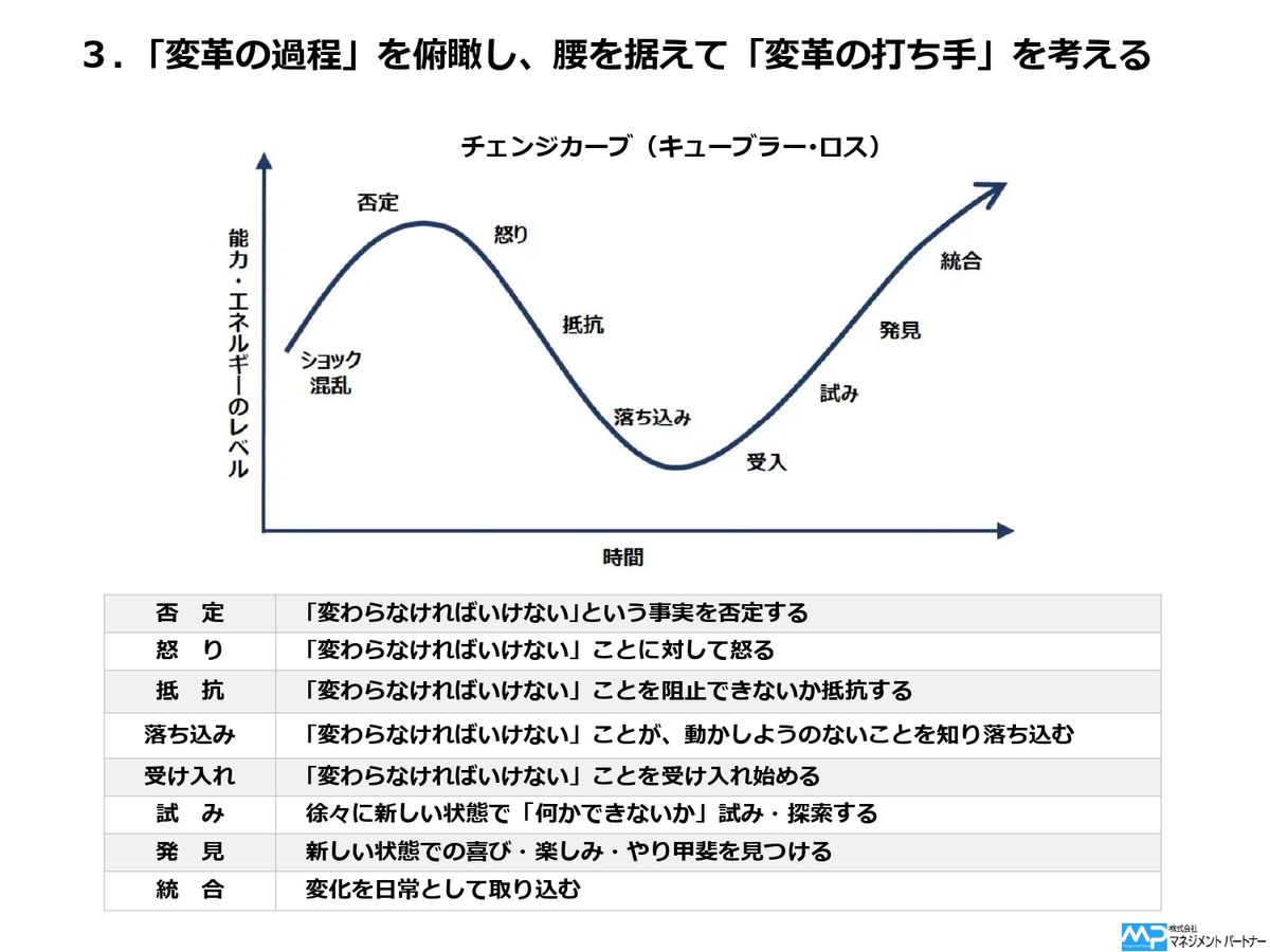 それだけに、チェンジカーブの考え方を理解しておくことは重要です。変革のプロセスが今、自社でどういうレベルなのか、どういう段階なのかによって打ち手は変わるわけです。こういったイメージを持ちながら変革課題に取り組んでいく。慌てないことです。