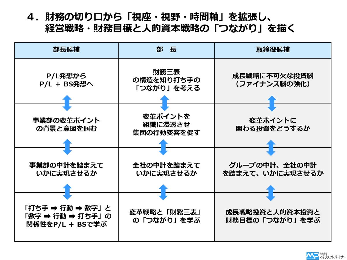また、ここがしっかりしていないと、中計における戦略と財務目標のつながりをうまく説明できないと思います。そういう意味では、部長クラスには、変革戦略と財務三表のつながりを学んでいただくということです。