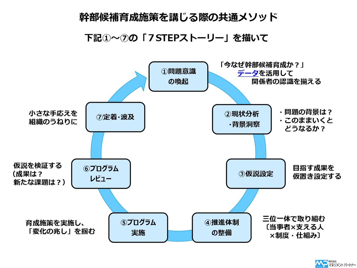 1つ目、経営幹部を育てる共通のメソッドです。ポイントは「7STEPストーリー」を描くことです。7STEPストーリーというのは、こういう方々を育てたいとなった時に、なぜ今回のような幹部候補者の育成が大切なのか、データを活用して関係者の認識を揃えることです。