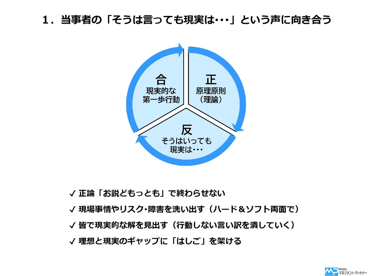本音の奥にある思い込み・決めつけをあぶり出し、一緒になって考える。これをもう少し詳しく説明しますと、我々のノウハウとしては「正・反・合」をファシリテーションでかなり切り込んでいきます。