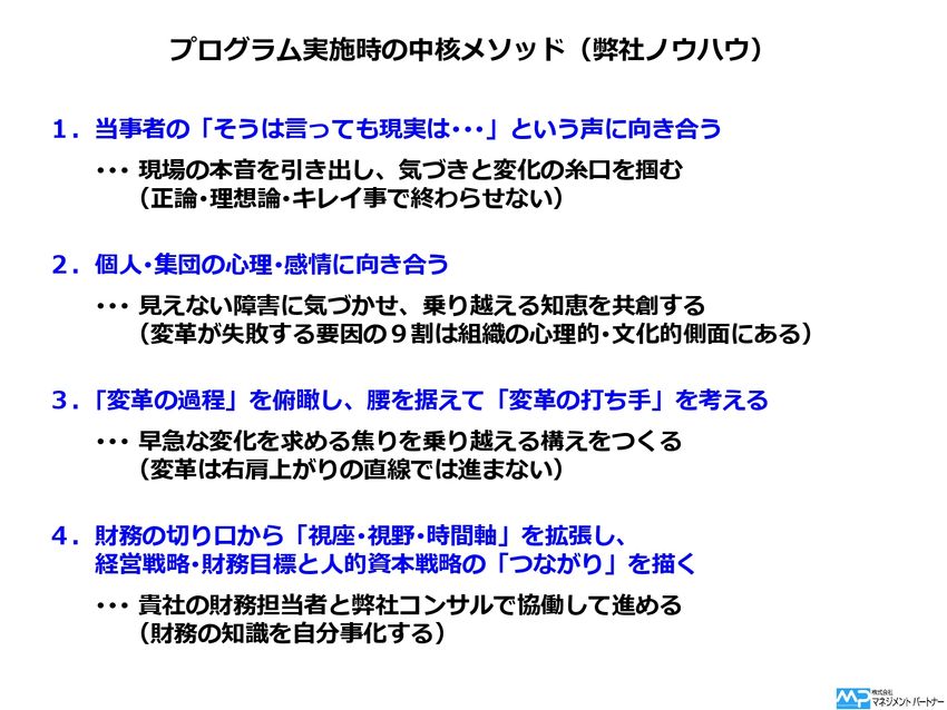 ・本音の奥にある思い込みをあぶり出し、変革プロセスを理解した上で役職に応じた財務理解を深めることが経営幹部育成の鍵となります。