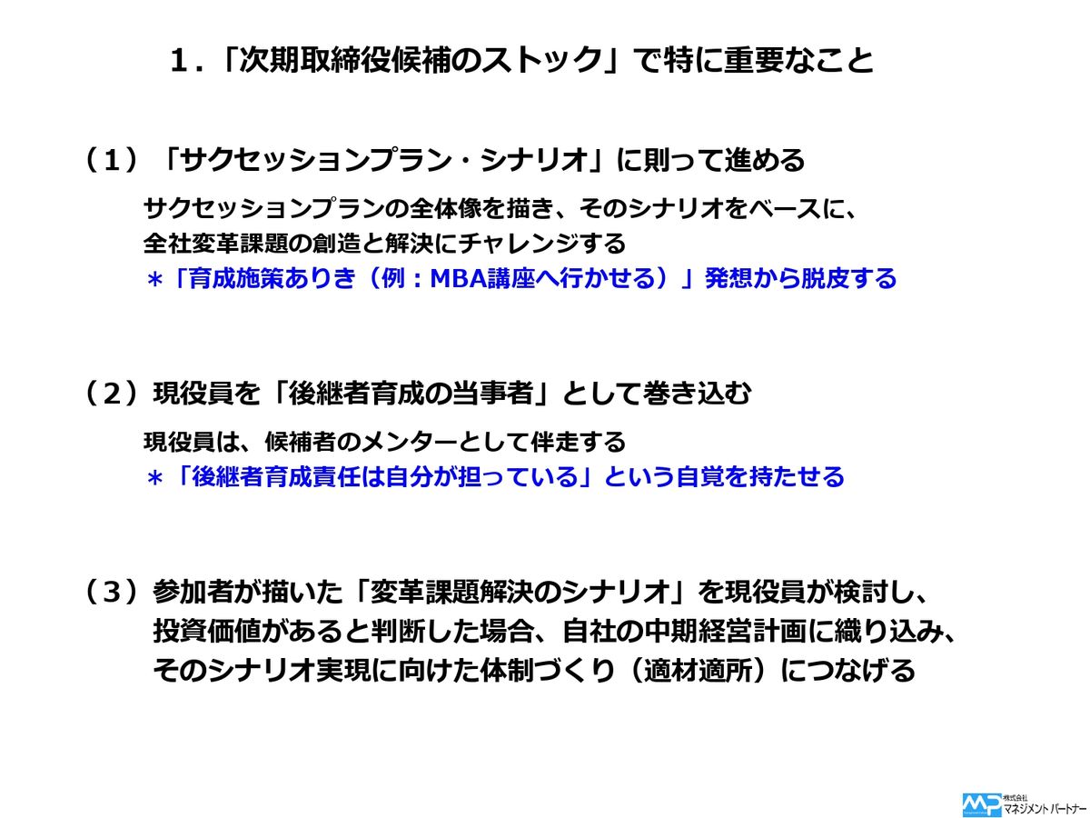 廣田文將氏:(スライドを示して)それらを3つの事例の中でお話しします。まず冒頭に申し上げるのは、次期取締役候補のストックですね。特に重要なことは、この3点です。