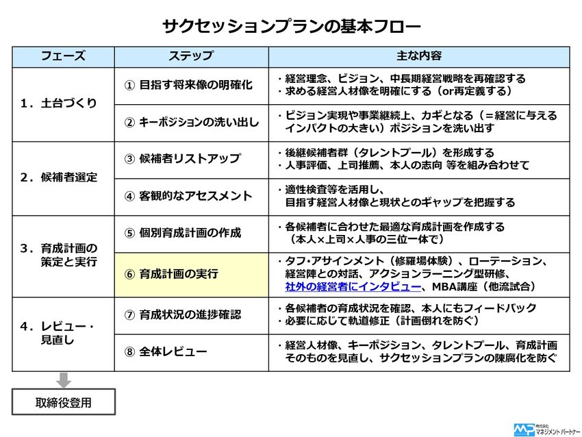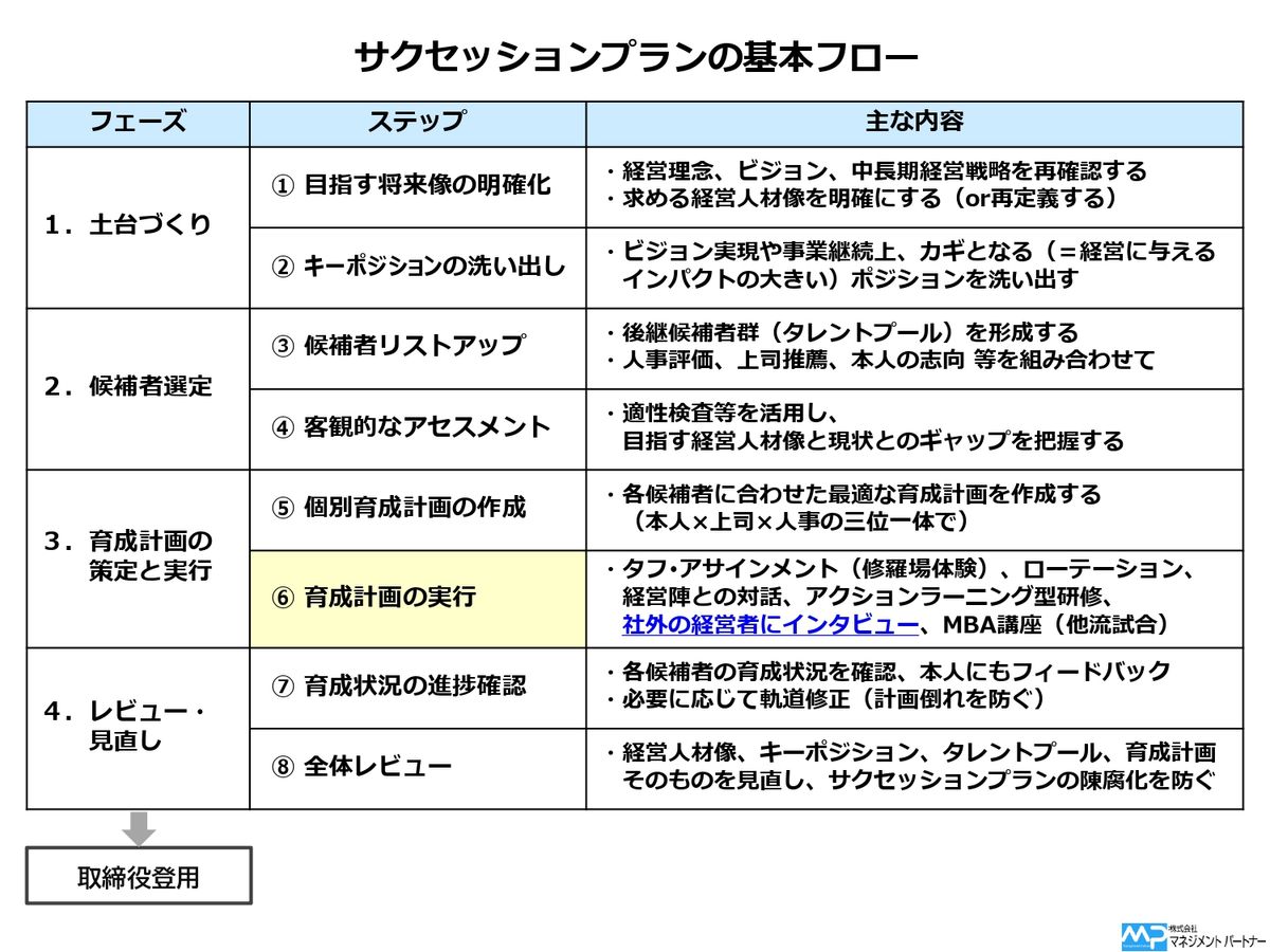 そういったサクセッションプランについて「でもどうやればステップがうまくいくのかな」と思われる方もいらっしゃるので、基本フローを整理しました。7STEPの途中、レビュー・見直しのところまでですが、具体的な流れを参考にしてみてください。