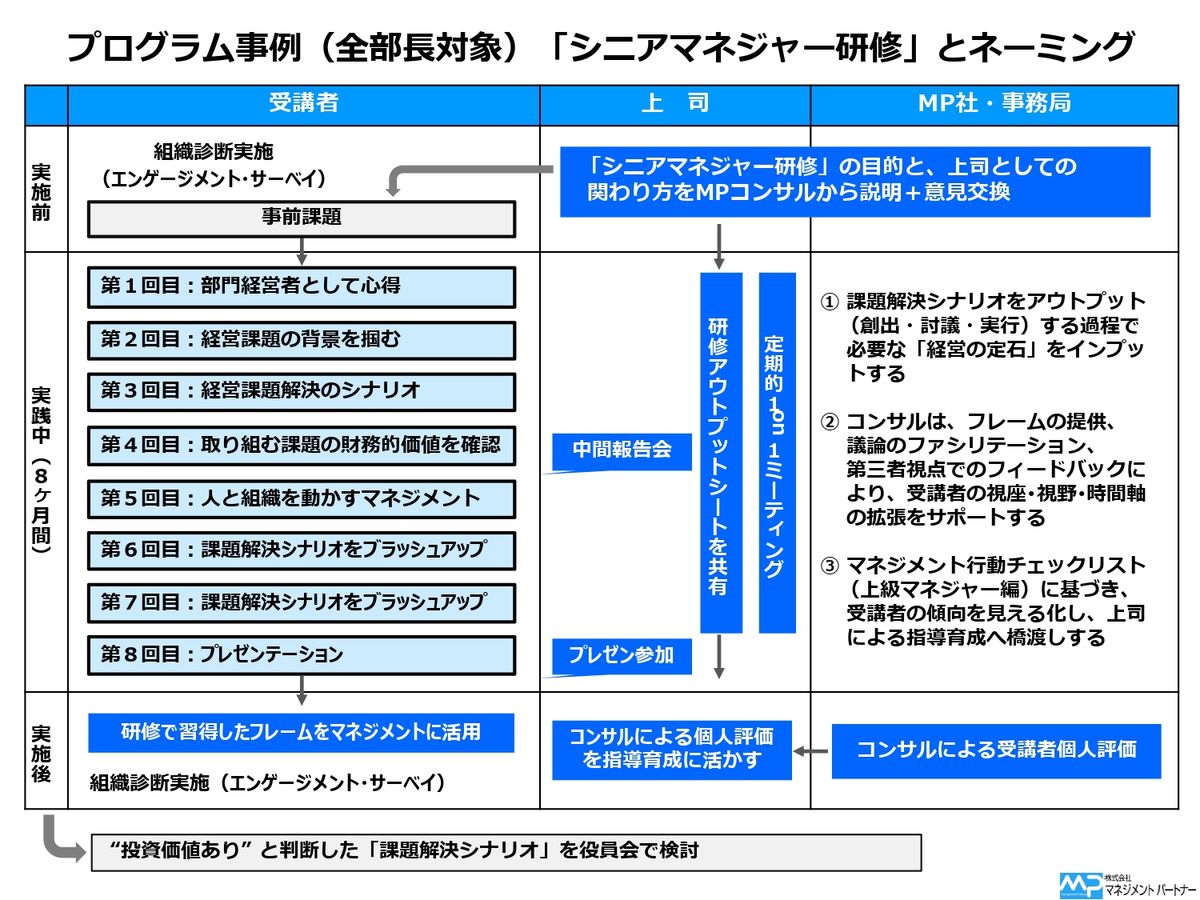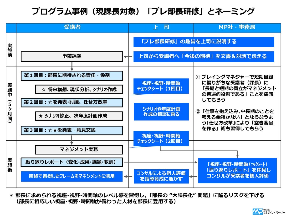 その具体的なプログラムの例はこれです。これは各社さんによって変わりますけれども、大課長化しているパターンは、課長としての知識とかは豊富ではあるものの、部長としての知識は弱いものです。このあたりの回数はちょっと多く見えますが、経営フレームはある程度、最低限として学んでいただくことは多々あります。