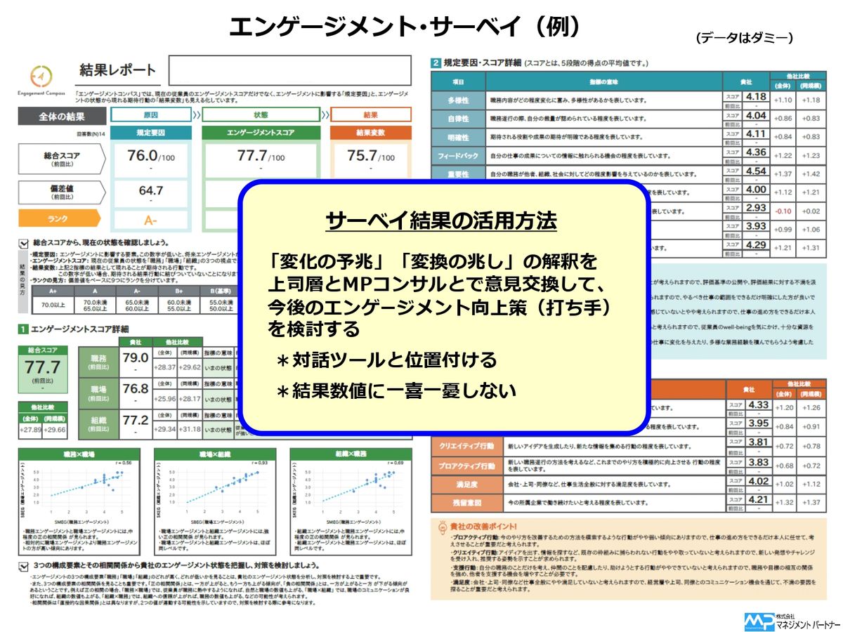 サーベイ結果の活用方法、その変化の予兆、変化の兆しといったものをどう解釈するのか、上位層と我々で意見交換して、今後のエンゲージメント向上の打ち手を検討していきます。