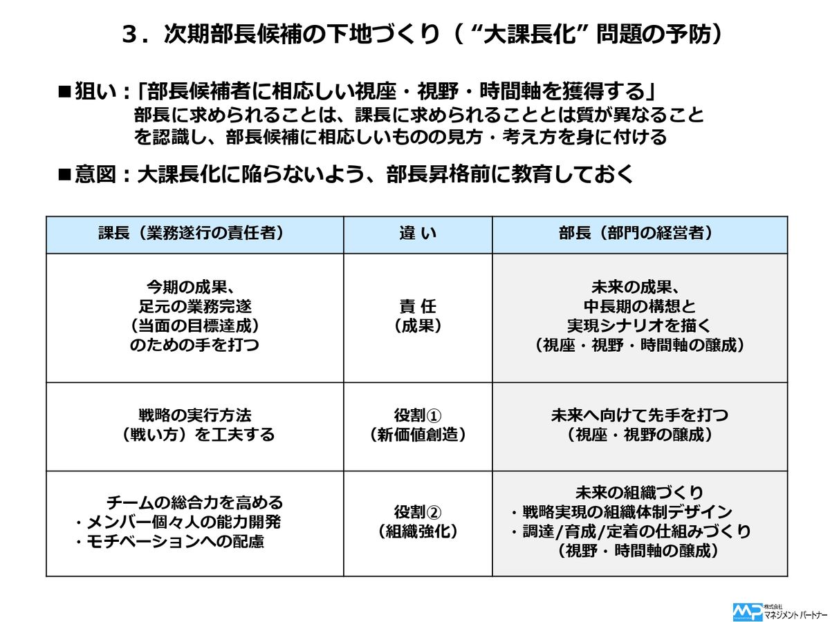 役職がついたからといって、発想が急に変わるわけではありません。ですからプレ部長研修と位置づけて、大課長化問題に陥らないようなことをやっていきます。