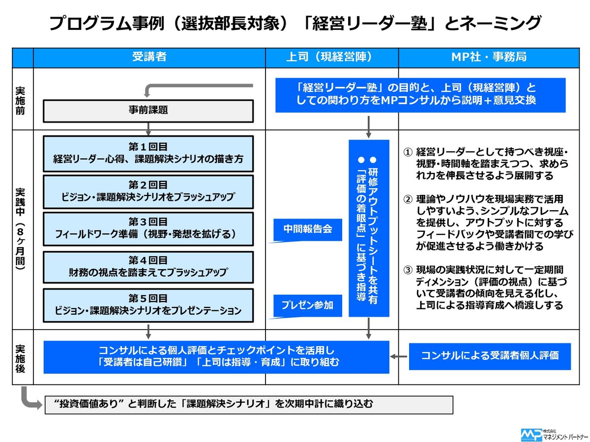 それらをプログラムで言えば、例えばこういった流れです。事前課題。そしてこれらをやったあと、中計へのつなぎと同時に、組織への影響と共に個々人もディメンション評価します。これは我々第三者により評価されます。