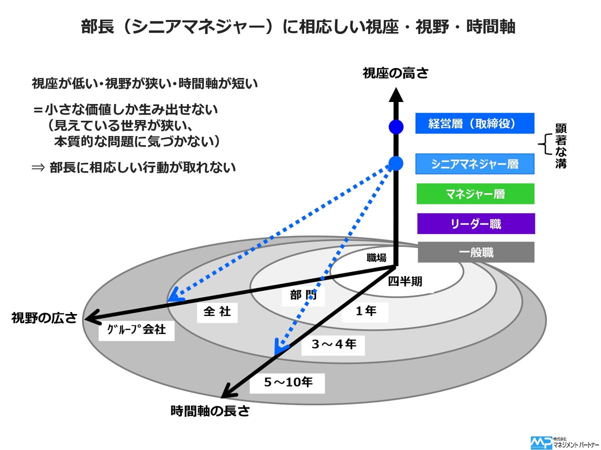 (スライドを示して)視座・視野のイメージはこれです。先ほどは部長でしたが、経営層とは確かに顕著な溝があります。こういった視座を高めて視野を広げて、先々を見通す力というのをつけながら、部長にふさわしい行動をとっていただこうということがポイントです。