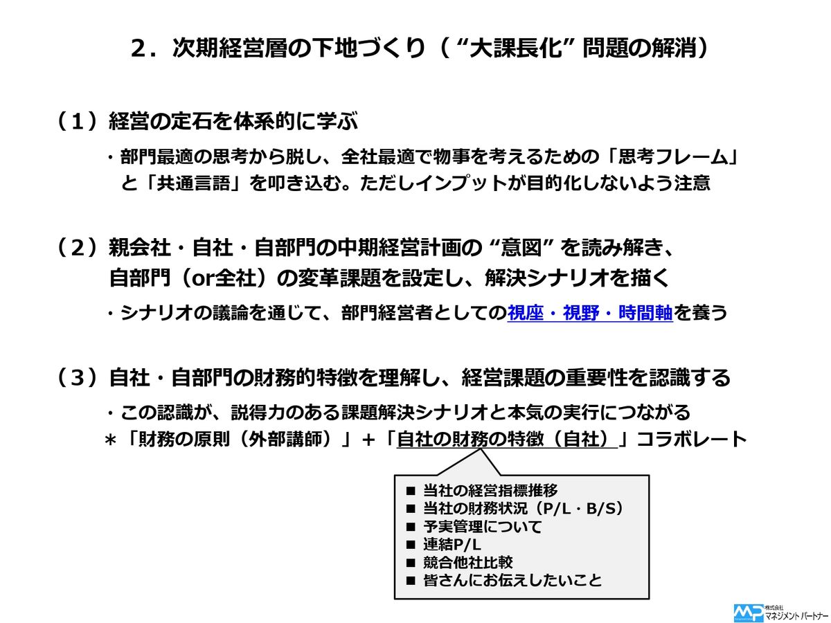 2つ目、これは大課長の場合のポイント。まずは視野を広げてもらうために、経営の定石、思考フレームを体系的に学んでもらいます。そうしながら共通言語を作り出して、組織に浸透していく。