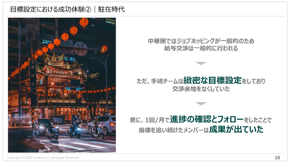 (目標設定における成功体験が)もう1つあります。僕自身、駐在の経験があります。上海や北京などの中華圏は、かなり(デジタルマーケティング業界が)強かったんです。そっちの文化圏だとデジタルマーケティングの業界は、1社目で1年やって次の会社に行くと、だいたい10パーセントぐらい給料が上がるので、給与交渉がガンガン行われる状況でした。
