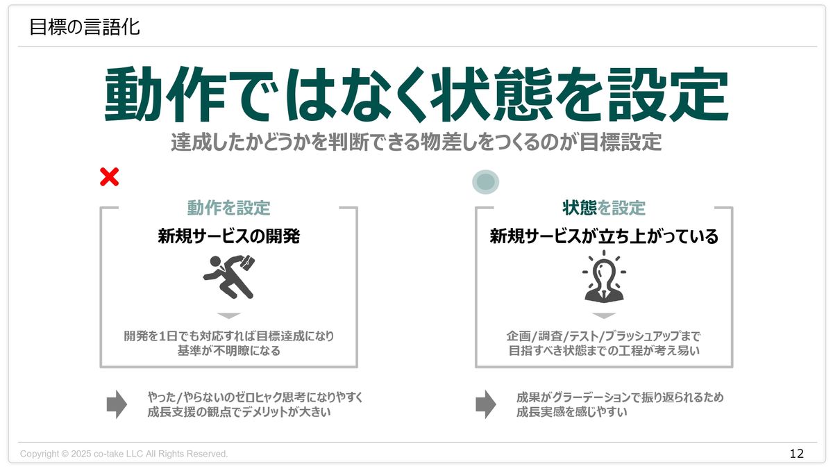 例えば「新規サービスを開発する」みたいな目標を立てたとします。これは極論ではあるんですけど、(目標を)動作にすると、「じゃあ、開発を1日でもやったら、これって目標達成なんですか?」みたいになってしまいます。基準がかなり不明瞭になっちゃうところがネガティブな要素です。