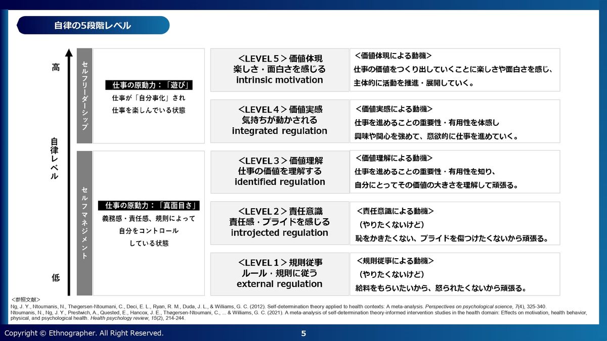 まず、低いレベルの自律はどういう状態なのか。先ほど経営者の方が「自分を律する」とおっしゃっていた、という話をしたのですが、要するに、自分自身の気持ちを抑えて、真面目に振る舞うことなんですよね。義務感、責任感、あるいはルール、そういう自分の外にある影響要因に突き動かされながら自分をコントロールする状態です。