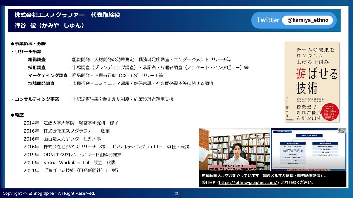 簡単に自己紹介をさせてください。エスノグラファーという会社をやっています。ビジネスリサーチの会社です。組織調査や採用系の調査、最近ですとエンゲージメントや心理的安全性、オンボーディングの調査、あるいは商品開発ですね。マーケティング関連の調査や地域開発の調査などをやっています。