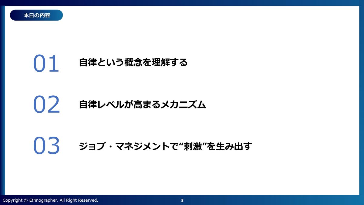 さらに、それの実践的なアプローチとしてジョブ・マネジメントですね。ここでは仕事をどのようにハンドリングすると自律レベルが高まっていくのか。その要点についてお伝えしたいなと思います。