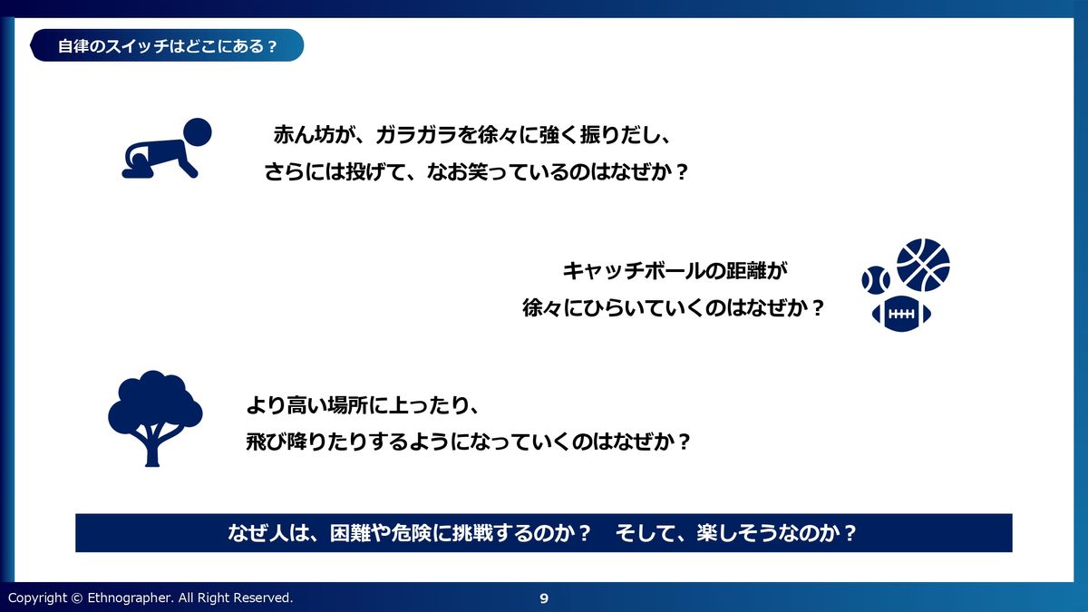 あとは、幼稚園児が公園で遊んでいるのを見てもそうです。高いところに上ったり、あえて変なブランコの乗り方をしたり、滑り台を逆さまに滑ったりしながら笑っているわけです。なんでそういう危ないことをしておもしろがっているのかということですね。ここに自律レベルを高めるヒントがあります。