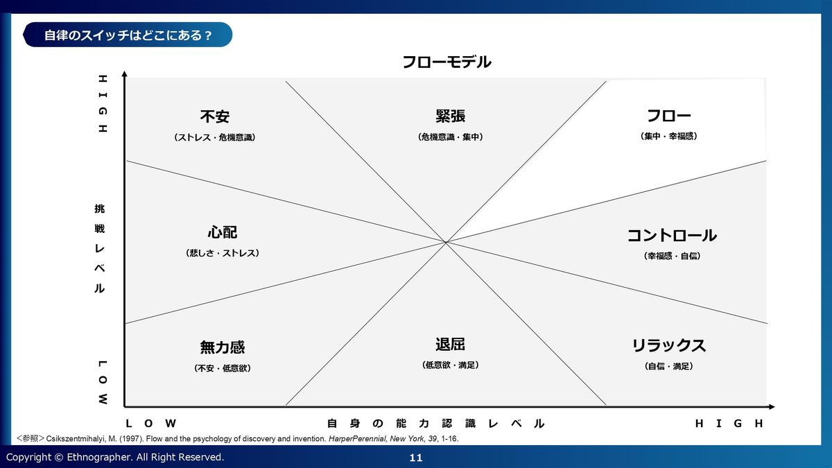 これと同じような論理で提唱しているのが、チクセントミハイのフロー理論です。チクセントミハイは心理学の研究者ですが、ロッククライマーやミュージシャンやアーティストなど、彼らがパフォーマンスを最も発揮する時、つまりフロー状態がどういうふうにして生まれるのかを研究したんですね。