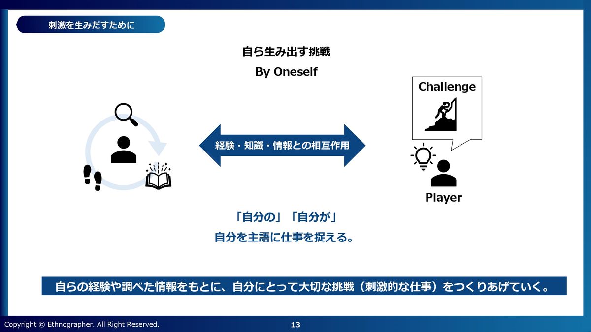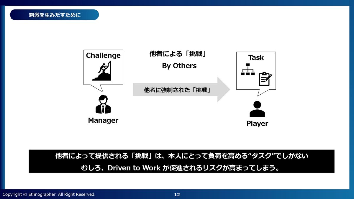 しかも上司から指示されたことをやらなきゃいけないという義務感が発生するので、むしろDriven to Workが促されて、自律レベルが低下してしまいます。だから上司が挑戦を指示するのは実はNGなんです。トップダウンで挑戦を指示するのはやってはいけないことなんです。じゃあ、どうすればいいのかというと、自分で挑戦を作らせるのが一番いいんです。