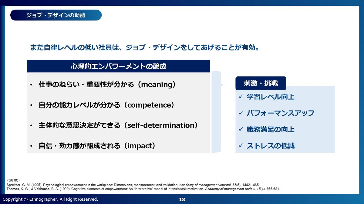 ジョブ・デザインを適切にすることができれば、刺激や挑戦も生まれやすくなります。自分が「能力レベルはこれぐらいしかないな」というのがわかったら、次のレベルにちょっとステップアップしてみようかということもできると思います。