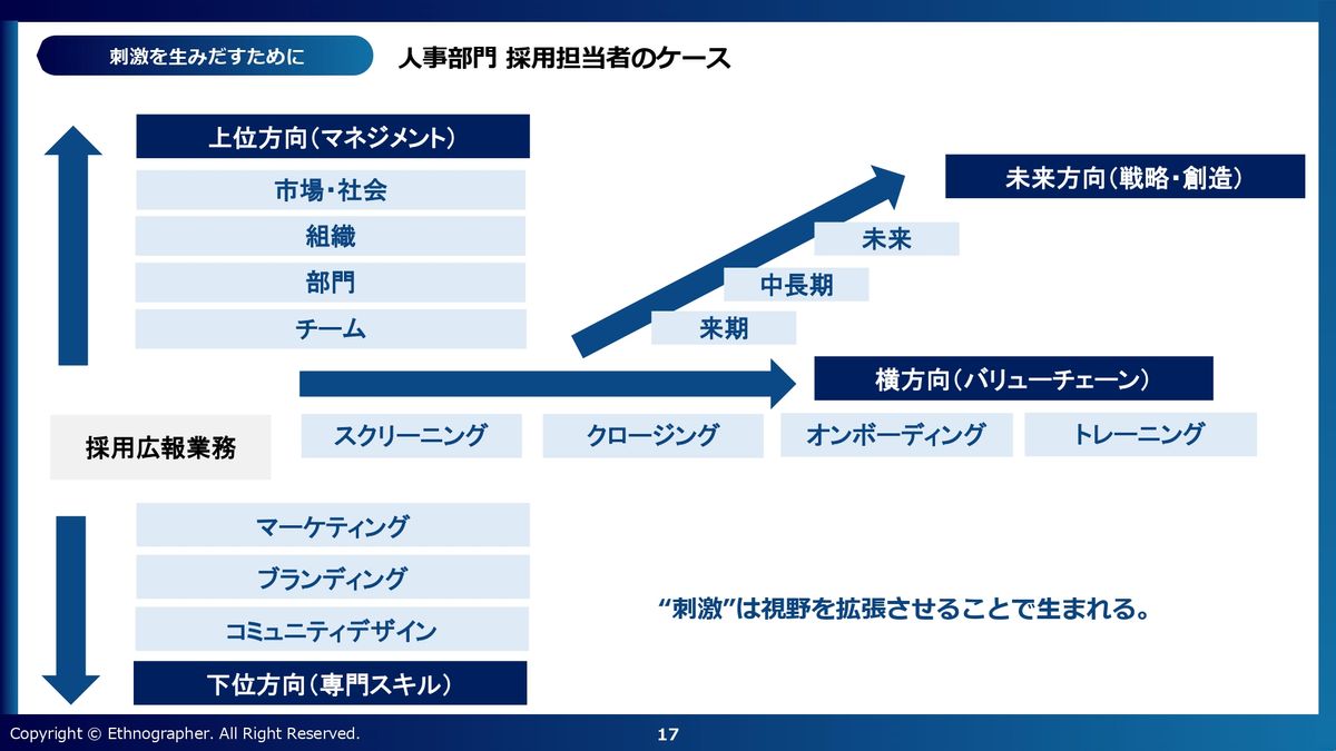 マーケティングの要素をもっと採用業務に取り入れたり、ブランディングや採用母集団のコミュニティデザインの業務を自分の業務に含めていく。こういう専門性の割合をより強化していくことによって刺激を作るというやり方もあります。