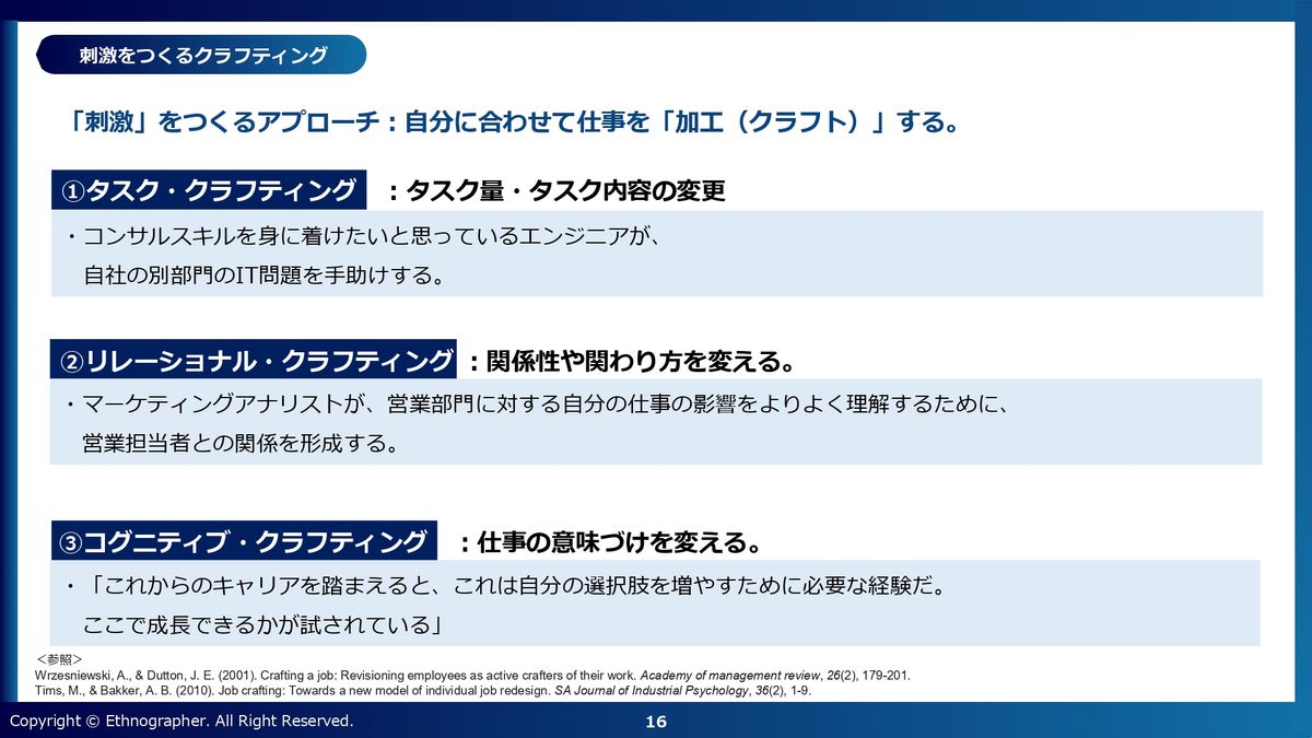 あとはリレーショナル・クラフティングですね。一緒に働く人を調整します。アプローチするお客さんを変えるとか、一緒に働く仲間を変える、パートナーを変えるというかたちで、自分にとって刺激的な仲間と一緒に働くことができれば、当然自律レベルは高まりやすくなります。