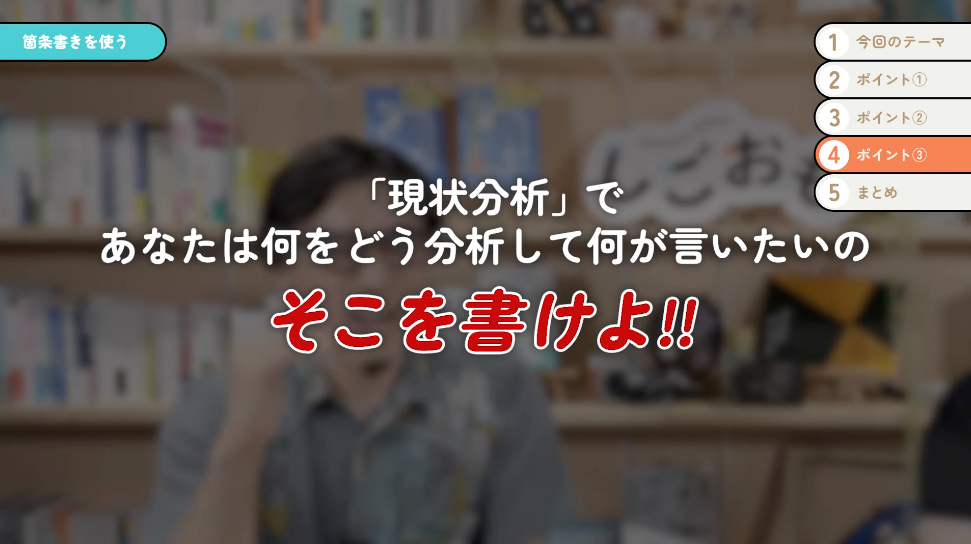 豊間根:ちなみにこの、文字で書くっていうやつも1個ポイントがあって。箇条書きにしないほうがいいです。箇条書きは箇条書きなんだけど。例えば、「現状分析」みたいな……。