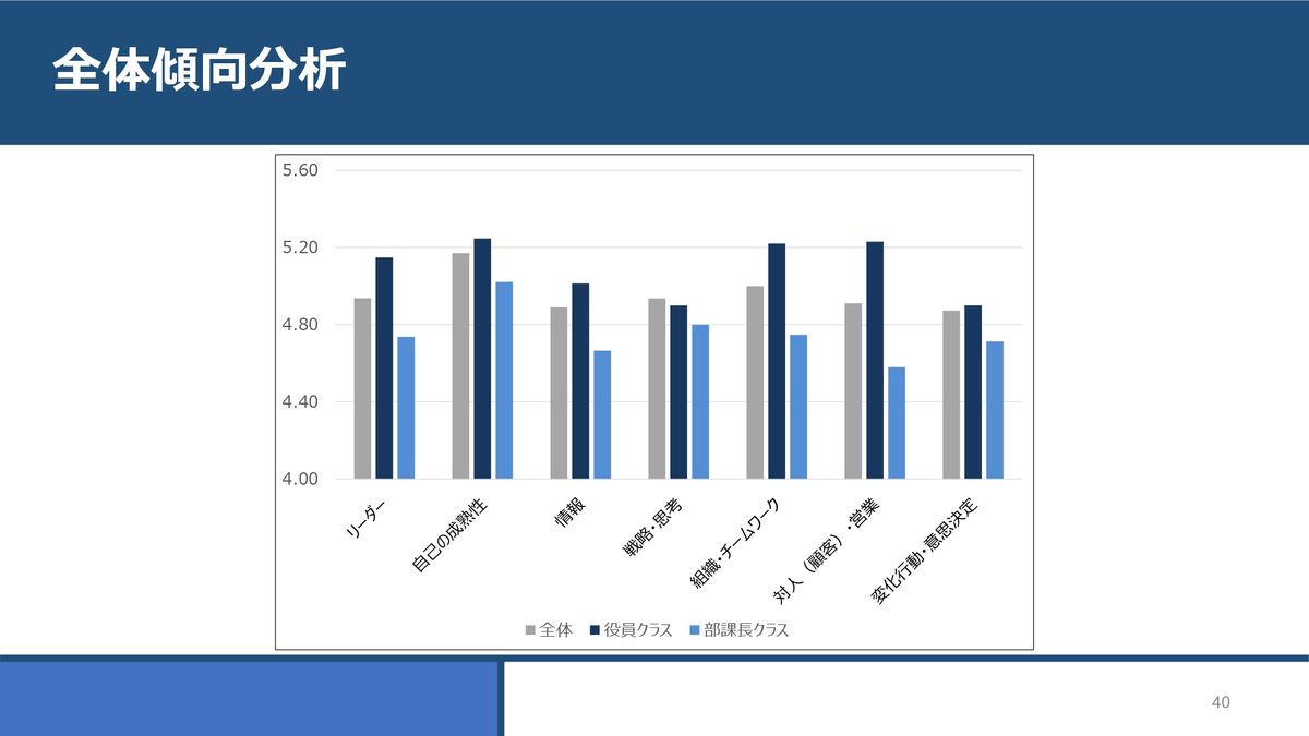 例えばこの例は、役員クラスと部課長クラス、全体の結果をグラフ化したものです。全体として、「自己の成熟性はみなさん高い」とか、情報収集や変化行動・意思決定が課題となっているということが見て取れます。